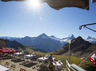 Les visiteurs d'un jour trouvent également leur compte au Berghotel Faulhorn. Une terrasse ensoleillée avec une vue magnifique sur la montagne t'attend au sommet. L'hôtel de montagne reste fermé pendant les mois d'hiver.